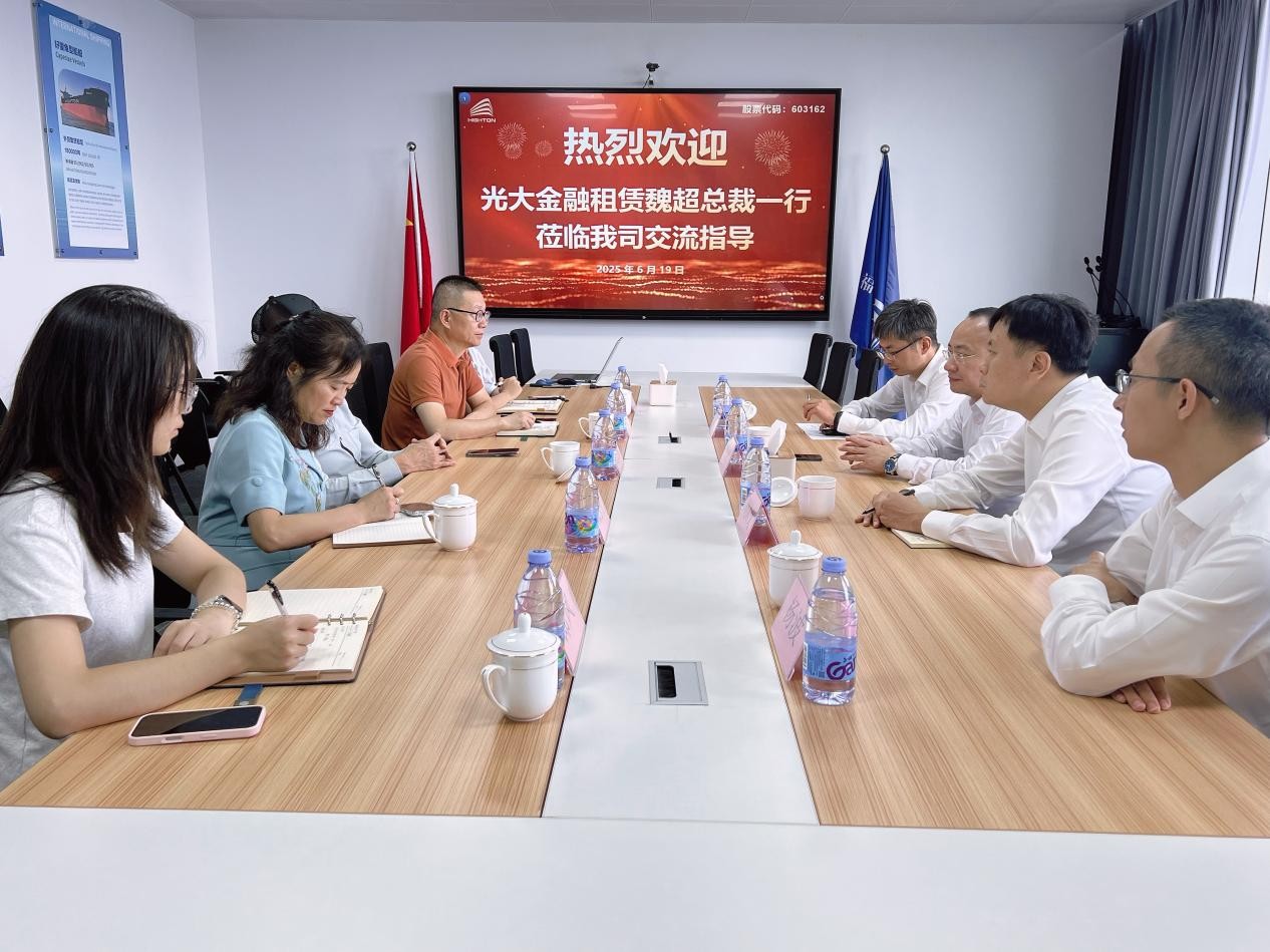 6月19日,光大金融租賃股份有限公司總裁魏超一行蒞臨海通發(fā)展開展業(yè)務交流。雙方圍繞船舶經(jīng)營性租賃、市場前景及國際形勢等議題展開深入探討。海通發(fā)展董事長曾而斌,副董事長、總經(jīng)理鄭玉芳,董事、副總經(jīng)理、財務總監(jiān)劉國勇等人熱情接待并參與座談。